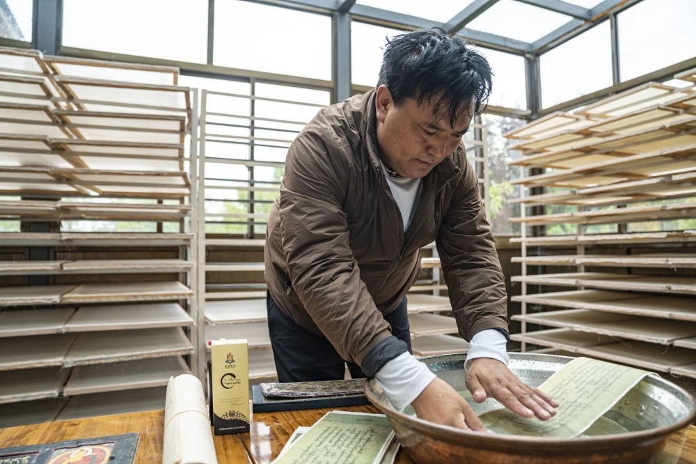 ↑在西藏米林市羌納鄉(xiāng)西嘎門巴村,南迦巴瓦童螺嘎布工藝品農(nóng)民專業(yè)合作社的工作人員正在測試藏紙的防水性(7月26日攝)。