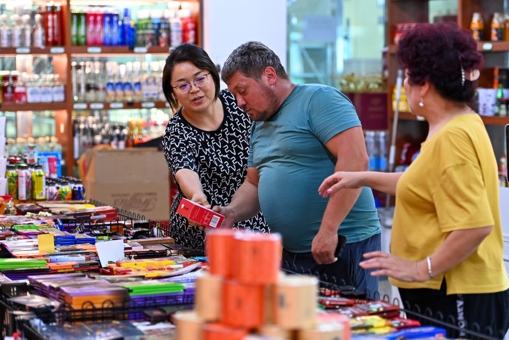 在新疆塔城巴克圖中哈邊民互市絲路文化商品城,一位哈薩克斯坦的游客在選購商品(7月22日攝)。新華社記者丁磊 攝