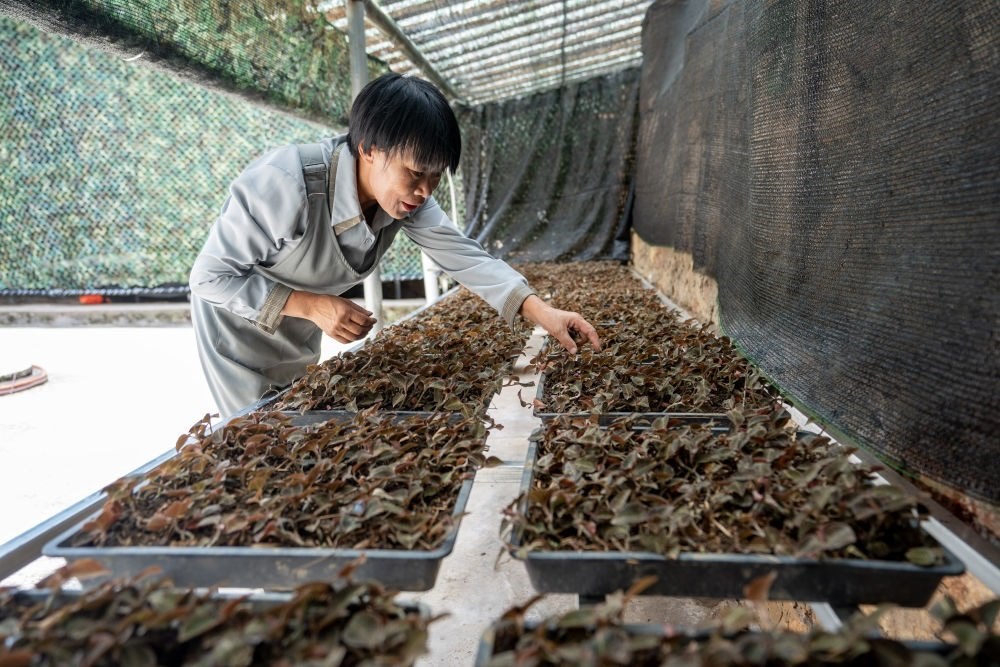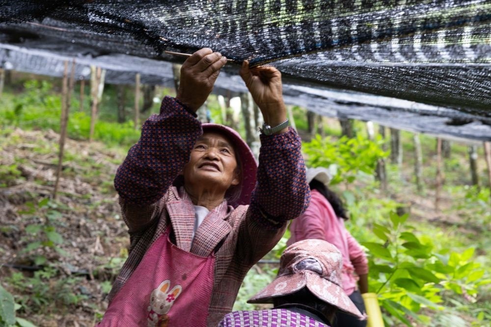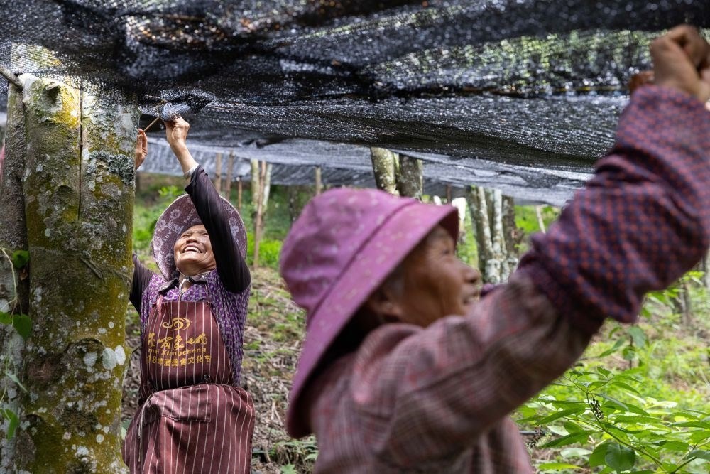 7月27日,工作人員在云南西疇縣西灑鎮(zhèn)的中藥材基地修補(bǔ)遮陽(yáng)網(wǎng)。新華社記者 呂帥 攝