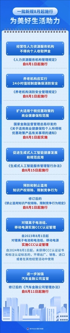 ·一批民生新規(guī)8月開始施行。從完善人力資源服務機構(gòu)管理,到強化養(yǎng)老機構(gòu)消防安全;從擴大適用個稅優(yōu)惠政策的商業(yè)健康保險范圍,到規(guī)范生成式人工智能服務……法治,為美好生活助力。