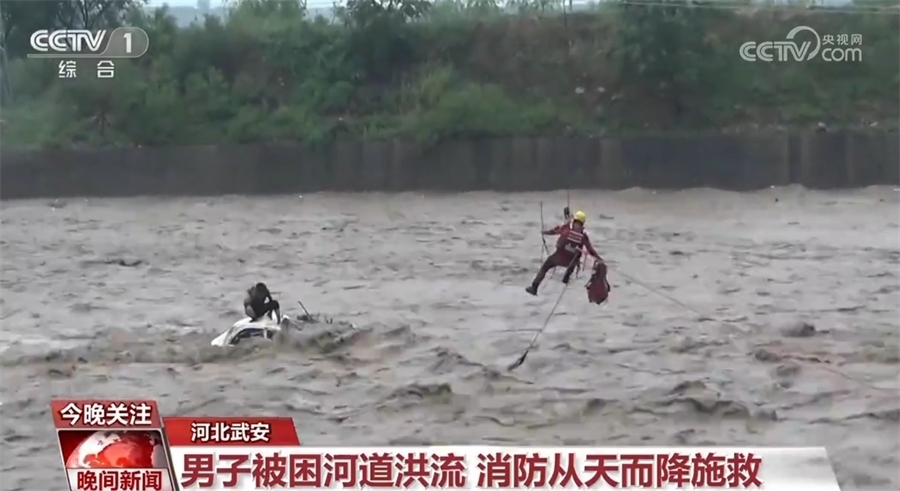 7月30日下午,河北武安一男子駕車涉水過橋時(shí),被湍急的洪水沖入洺河河道近百米,救援人員接警后立即趕往現(xiàn)場(chǎng)。從現(xiàn)場(chǎng)情況看,因水流過于湍急,被困車輛隨急流翻滾,洪流一度沒過車頂?,F(xiàn)場(chǎng)指揮員隨即協(xié)調(diào)起吊車等工程車輛協(xié)助進(jìn)行救援,最終經(jīng)過1小時(shí)20分的驚險(xiǎn)救援,被困男子成功獲救。