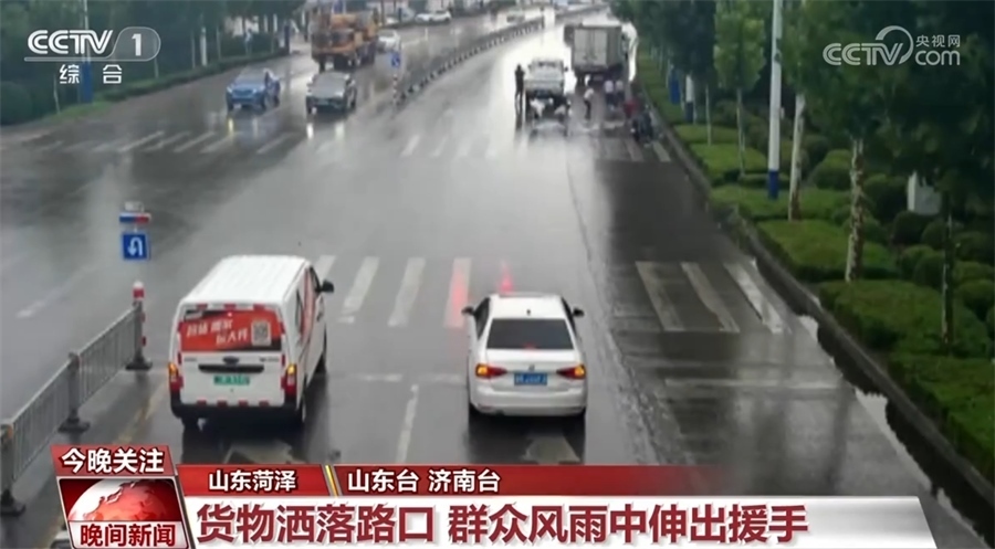 近日,山東菏澤定陶區(qū)出現(xiàn)持續(xù)強(qiáng)降雨過程,因雨天路滑,一輛載滿貨物的車輛轉(zhuǎn)彎時(shí),車上裝載的一噸多礦泉水灑落一地,風(fēng)大雨急,貨車司機(jī)束手無策。這時(shí),又一輛貨車停在了車前,從車上下來三位女士幫助貨車司機(jī)搬運(yùn)貨物,過往群眾也紛紛冒雨參與其中。在大家共同努力下,灑落的貨物十分鐘就被整理干凈。
