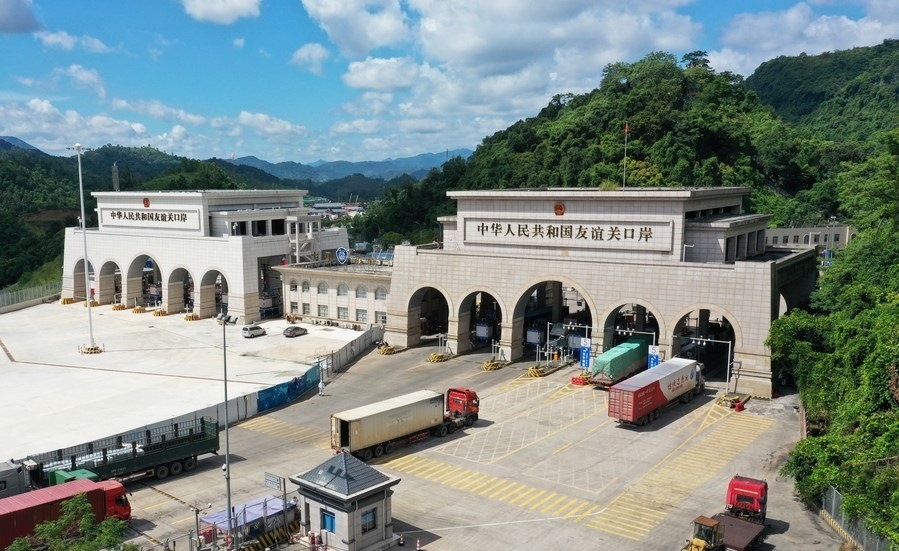 這是在廣西憑祥友誼關(guān)口岸通關(guān)的運(yùn)輸車輛(無(wú)人機(jī)照片)。新華社記者 楊馳 攝