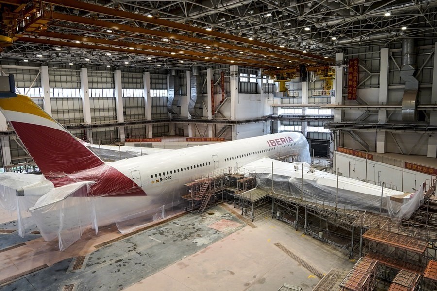 5月11日,噴涂作業(yè)員對(duì)空客A350-900寬體客機(jī)進(jìn)行打磨除漆。新華社記者 張麗蕓 攝