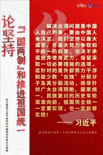 解決臺灣問題、實現(xiàn)祖國完全統(tǒng)一,是中國共產(chǎn)黨矢志不渝的歷史任務(wù),是全體中華兒女的共同愿望,是實現(xiàn)中華民族偉大復(fù)興的必然要求。必須堅持貫徹新時代黨解決臺灣問題的總體方略,牢牢把握兩岸關(guān)系主導(dǎo)權(quán)和主動權(quán),堅定不移推進祖國統(tǒng)一大業(yè)。