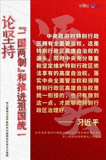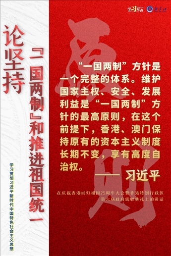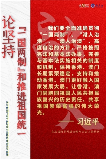 “一國兩制”是黨領(lǐng)導(dǎo)人民實現(xiàn)祖國和平統(tǒng)一的一項重要制度,是國家的一項基本國策。中國特色社會主義進入了新時代,意味著“一國兩制”事業(yè)也進入了新時代。不斷推進“一國兩制”在香港、澳門的成功實踐,是中華民族偉大復(fù)興歷史進程的重要組成部分。