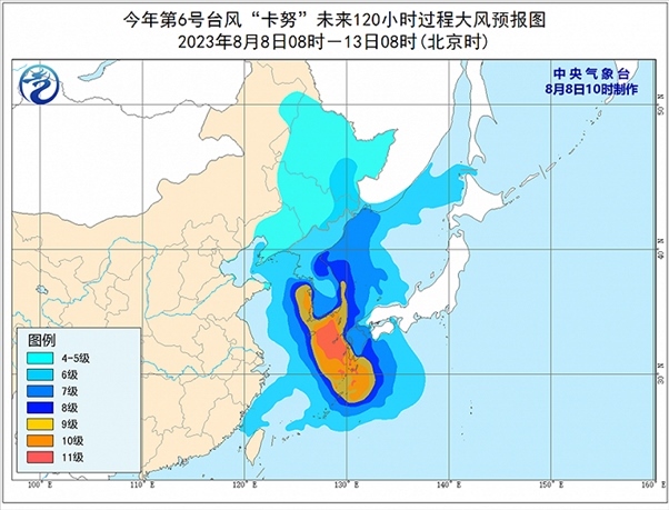預(yù)計今年第6號臺風(fēng)“卡努”將以每小時10公里左右的速度向北移動,強(qiáng)度將有所增強(qiáng),8月10日上午將在韓國南部沿海登陸,預(yù)計登陸時強(qiáng)度為強(qiáng)熱帶風(fēng)暴級或臺風(fēng)級(28~33米/秒,10~12級),11日夜間進(jìn)入我國東北地區(qū)境內(nèi),并逐漸減弱變性為溫帶氣旋。
