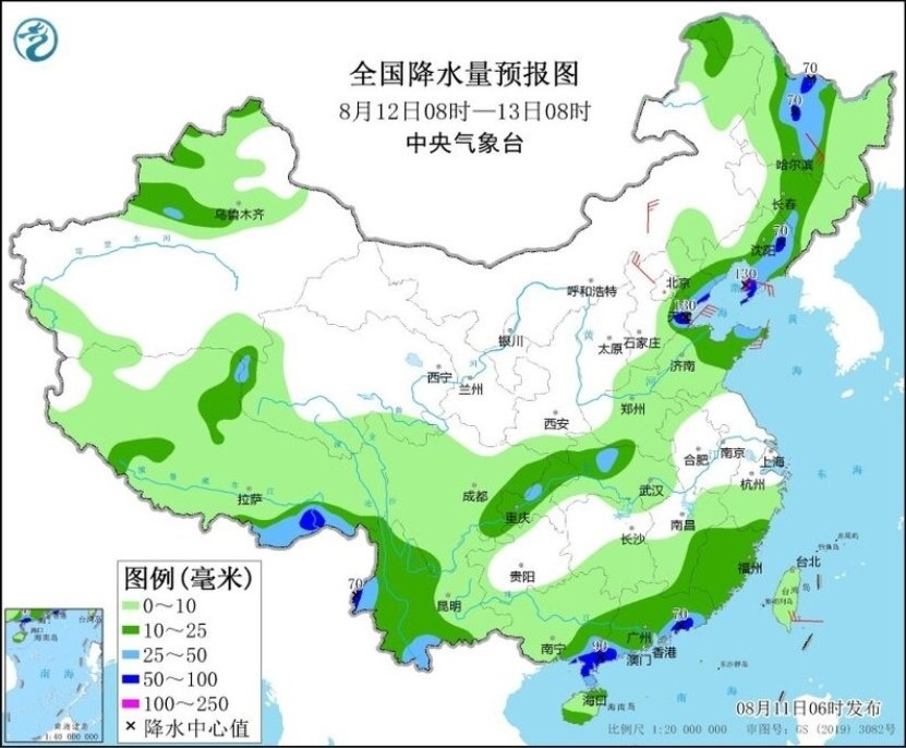 降雨預(yù)報(bào):11日下午至13日,遼寧、吉林、黑龍江等地部分地區(qū)有大到暴雨,局地有大暴雨;大部地區(qū)累計(jì)雨量30~80毫米、局地100~150毫米,遼寧東部局地將超過(guò)200毫米。具體預(yù)報(bào)如下: