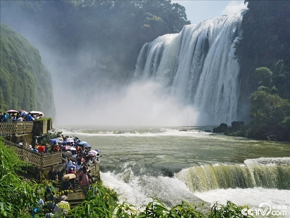8月11日,貴州安順,游客在黃果樹瀑布景區(qū)游覽。暑期以來(lái),黃果樹風(fēng)景區(qū)瀑布水勢(shì)磅礴、飛瀉而下,進(jìn)入最佳觀賞季。