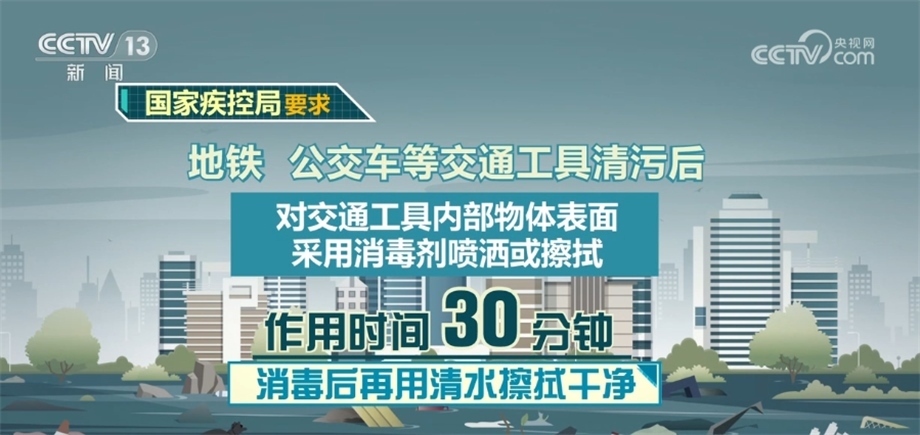 地鐵、公交車等交通工具清污后,對(duì)交通工具內(nèi)部物體表面采用消毒劑噴灑或擦拭,作用時(shí)間30分鐘,消毒后再用清水擦拭干凈。
