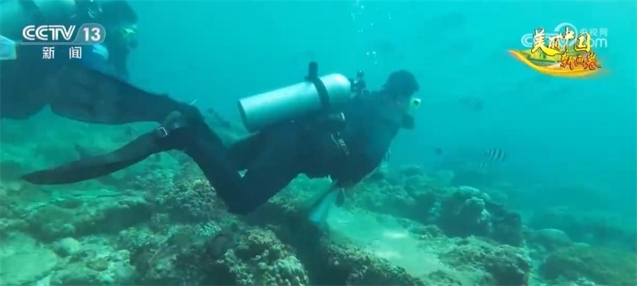 總臺央視記者 焦?。?/strong>我現(xiàn)在位于海南三亞蜈支洲島,在我身旁的這片海域就是我國的第一個熱帶海洋牧場。這段時間,海洋牧場正在進(jìn)行珊瑚移植和調(diào)裝魚礁的工作。我們帶著水下攝像機,跟隨著工作人員一起進(jìn)入海底,體驗在海里如何“植樹造林”。