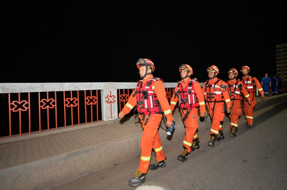 8月9日凌晨,在天津市靜海區(qū)臺頭鎮(zhèn),天津消防救援總隊的消防員巡查經(jīng)過革命橋。新華每日電訊記者孫凡越攝