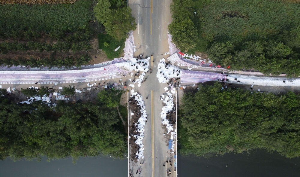 武警第一機動總隊某支隊官兵在大清河支渠橋處搶筑堤壩(8月10日攝,無人機照片)。新華每日電訊記者趙子碩攝