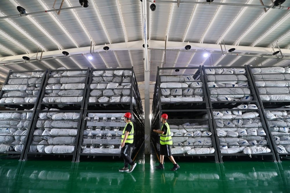 工作人員在天津市救災(zāi)物資儲備站內(nèi)的倉庫巡查(8月16日攝)。新華每日電訊記者李然攝