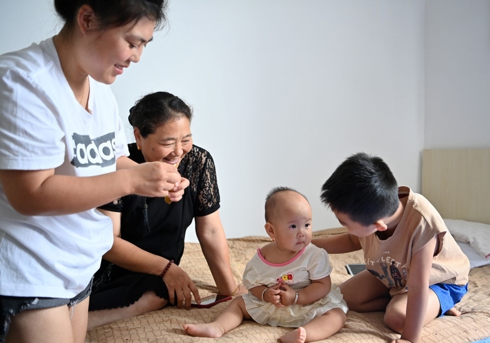 轉(zhuǎn)移群眾在天津市西青區(qū)親和儒園安置點內(nèi)照看小孩(8月9日攝)。新華每日電訊李然攝