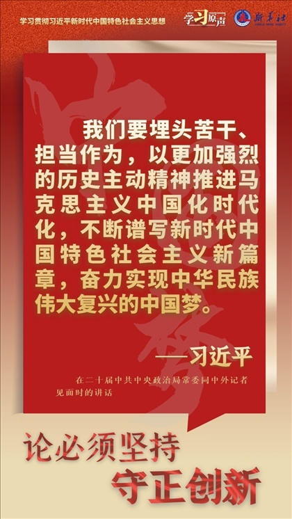 我們從事的是前無古人的偉大事業(yè),守正才能不迷失方向、不犯顛覆性錯誤,創(chuàng)新才能把握時代、引領(lǐng)時代。我們要以科學(xué)的態(tài)度對待科學(xué)、以真理的精神追求真理,堅持馬克思主義基本原理不動搖,堅持黨的全面領(lǐng)導(dǎo)不動搖,堅持中國特色社會主義不動搖,緊跟時代步伐,順應(yīng)實踐發(fā)展,以滿腔熱忱對待一切新生事物,不斷拓展認(rèn)識的廣度和深度,敢于說前人沒有說過的新話,敢于干前人沒有干過的事情,以新的理論指導(dǎo)新的實踐。
