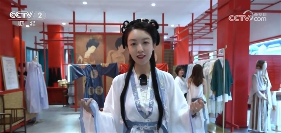 總臺央視記者 劉藝涵:沉浸式古鎮(zhèn)之旅一定少不了換裝體驗,也是不少游客來到這里首選的項目。目前,園區(qū)內(nèi)像這樣的古裝店共有7家,提供租賃、銷售、化妝造型和攝影等服務?,F(xiàn)在我身上的這件就是店里的一款經(jīng)典的漢服,全天的租賃價格是199元。