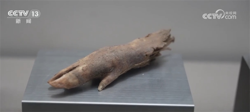 嘉峪關(guān)市紅領(lǐng)巾講解員 辛宇軒:這個(gè)是漢代豬蹄,是守衛(wèi)邊疆士卒們留下來的遺存之物,距今2000余年,是極為難得的長(zhǎng)城文物。我們可以看得出來,它的骨架、腳趾保存都是相對(duì)完好的,這是野豬的豬蹄,我們這邊氣候干燥,所以就不會(huì)把它給腐蝕掉。