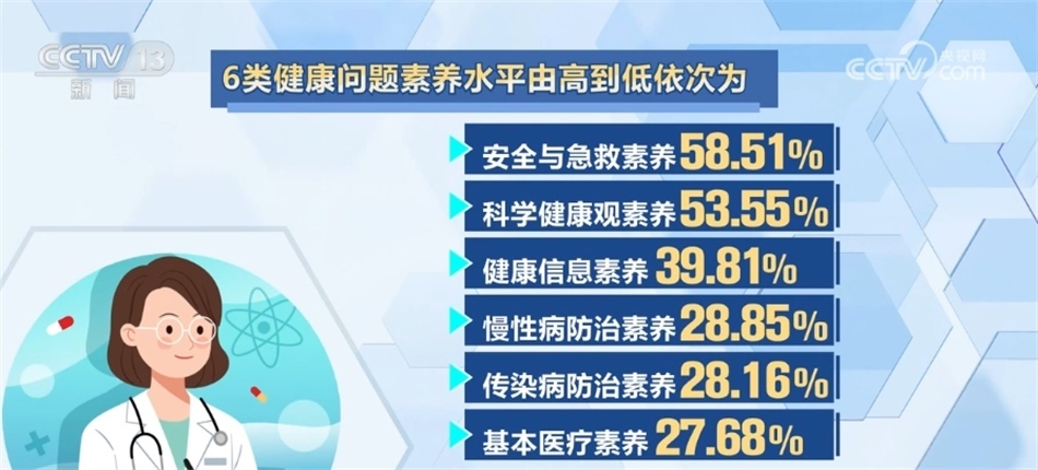 6類(lèi)健康問(wèn)題素養(yǎng)水平由高到低依次為:安全與急救素養(yǎng)58.51%、科學(xué)健康觀素養(yǎng)53.55%、健康信息素養(yǎng)39.81%、慢性病防治素養(yǎng)28.85%、傳染病防治素養(yǎng)28.16%和基本醫(yī)療素養(yǎng)27.68%。各類(lèi)健康問(wèn)題素養(yǎng)均有不同程度提升,其中,健康信息素養(yǎng)水平增幅最大,較2021年提升了3.88個(gè)百分點(diǎn)。本次監(jiān)測(cè)覆蓋31個(gè)?。ㄗ灾螀^(qū)、直轄市)的336個(gè)縣(區(qū))1008個(gè)鄉(xiāng)鎮(zhèn)(街道),對(duì)象為15—69歲常住人口。