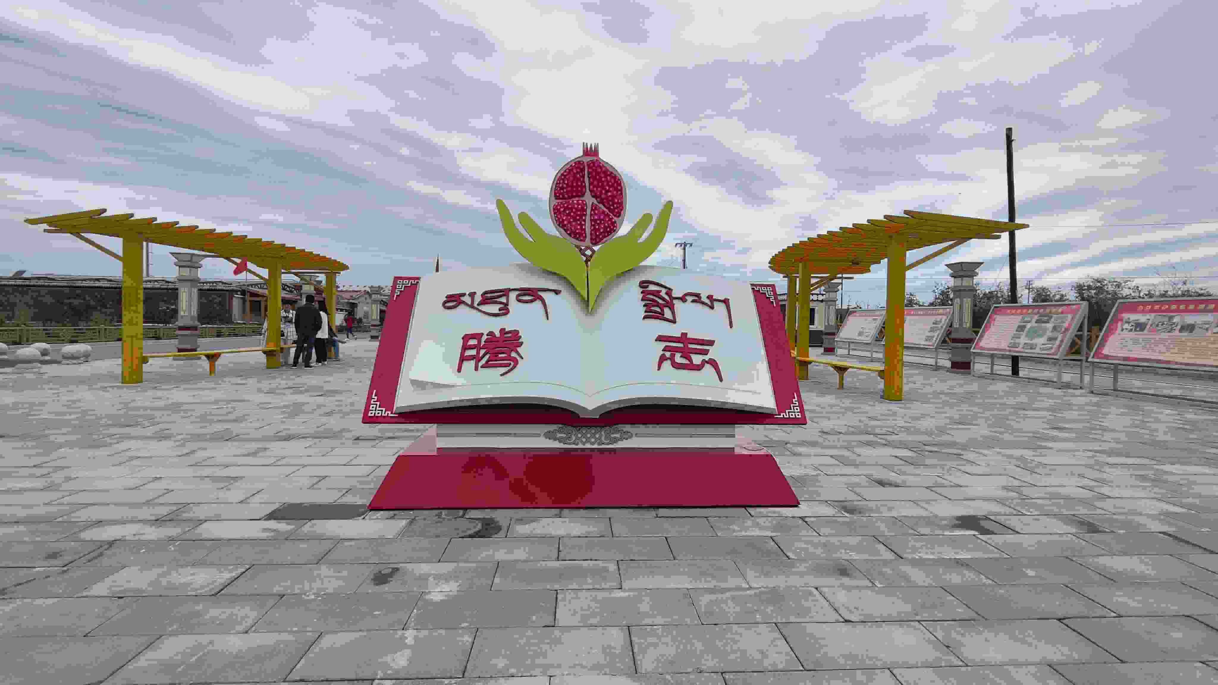 這些向好的變化離不開每一位村民的團(tuán)結(jié)友愛(ài)、互幫互助。村口的廣場(chǎng)中間有一本打開的書,書頁(yè)上一雙手托舉著一個(gè)鮮艷的石榴,這就是果洛藏貢麻村新修建的“騰志”廣場(chǎng)?!膀v志”在藏語(yǔ)中意為“團(tuán)結(jié)”,這也寓意著各民族像石榴籽一樣緊緊抱在一起,共育團(tuán)結(jié)花,共享幸福果。