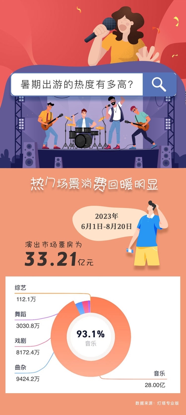 作為演出市場的傳統(tǒng)旺季,暑假期間演唱會、Live house、戲劇、音樂劇等各類熱門演出“一票難求”。根據(jù)燈塔專業(yè)版最新數(shù)據(jù),暑期檔中的6月1日至8月23日演出市場票房已經(jīng)超過30億元,而相當(dāng)可觀的跨城觀演比例,更引得除了演出票房之外的周邊產(chǎn)業(yè)一起火?!耙粋€演出圈粉一座城”,當(dāng)?shù)芈糜谓?jīng)濟不斷涌現(xiàn)新的可能。