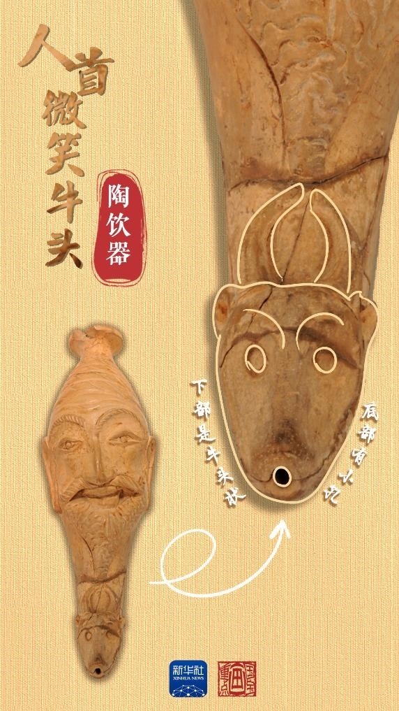 當中國絲綢的美譽經由古絲綢之路在西亞、歐洲等地傳揚時,西方文明也穿過風沙與長歌,在中國留下了印記。人首微笑牛頭陶飲器出土于和田地區(qū)約特干遺址,為唐代時期文物。飲器上部為人首形,下部是牛頭狀,底部帶小圓孔,上下兩部分內腔相通。人首上唇胡須外展卷翹,面帶微笑。牛頭微微上翹,牛角豎立攏圓。這種飲器造型源自“來通”,即末端為動物形或人首形的角杯,是小亞細亞和地中海地區(qū)常見的飲酒器具,絲綢之路沿線國家都有類似文物出土。