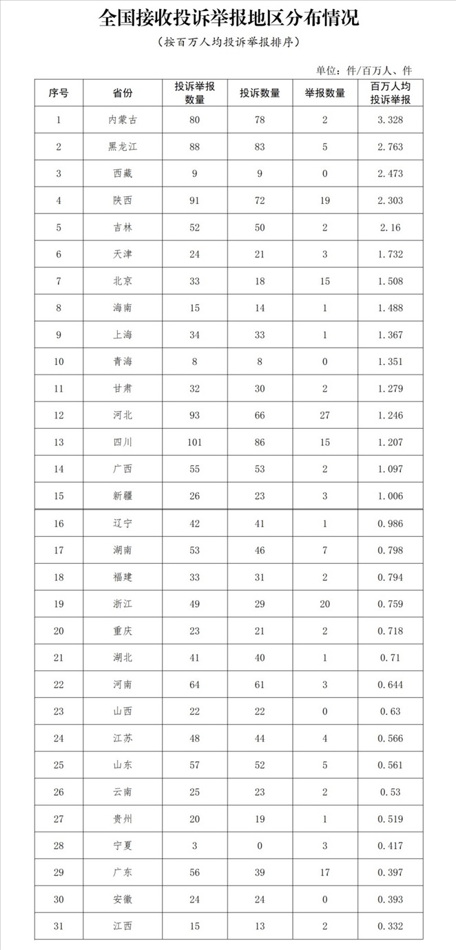 各?。ㄗ灾螀^(qū)、直轄市)按照接收投訴舉報數(shù)量排序,四川、河北、陜西、黑龍江、內(nèi)蒙古排在全國前5位。其中:按投訴數(shù)量排序,四川、黑龍江、內(nèi)蒙古、陜西、河北排在全國前5位;按舉報數(shù)量排序,河北、浙江、陜西、廣東、北京(四川并列)排在全國前5位;按百萬人均投訴舉報數(shù)量排序,內(nèi)蒙古、黑龍江、西藏、陜西、吉林排在全國前5位。(全國接收投訴舉報地區(qū)分布情況詳見附件1)