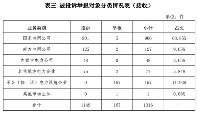 供電企業(yè)1158件、占投訴舉報總數(shù)的87.99%,其中國家電網(wǎng)公司906件、占投訴舉報總數(shù)的68.85%,南方電網(wǎng)公司127件、占投訴舉報總數(shù)的9.65%,內(nèi)蒙古電力公司48件、占投訴舉報總數(shù)的3.65%,其他地方電力企業(yè)77件、占投訴舉報總數(shù)的5.84%;承裝(修、試)電力設施企業(yè)157件、占投訴舉報總數(shù)的11.93%;其他市場主體1件、占投訴舉報總數(shù)的0.08%。