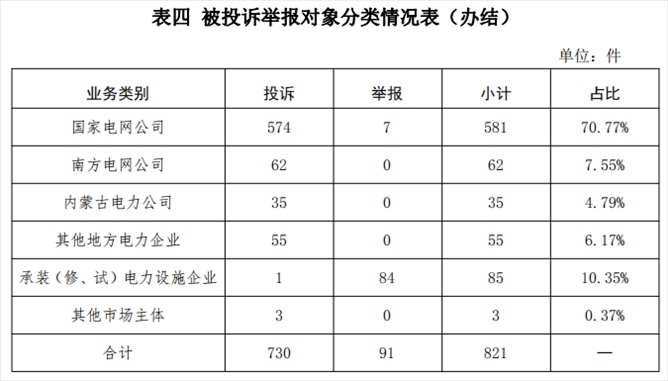 從被投訴舉報對象看,供電企業(yè)733件、占投訴舉報總數(shù)的89.28%,其中國家電網(wǎng)公司581件、占比70.77%,南方電網(wǎng)公司62件、占比7.55%,內(nèi)蒙古電力公司35件、占比3.65%,其他地方電力企業(yè)55件、占比6.17%;承裝(修、試)電力設施企業(yè)85件、占比10.35%;其他市場主體3件、占比0.37%。