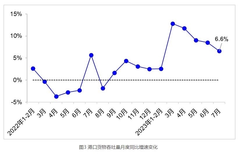 7月,全國(guó)港口完成貨物吞吐量14.3億噸,同比增長(zhǎng)6.6%,其中內(nèi)、外貿(mào)吞吐量分別增長(zhǎng)5.8%和8.5%。完成集裝箱吞吐量2705萬標(biāo)箱,同比增長(zhǎng)2.6%。