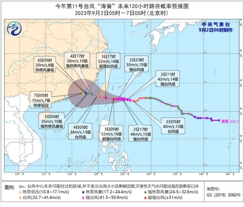 大風預報:9月2日08時至3日08時,受“蘇拉”影響,南海西北部、北部灣東部、瓊州海峽及廣東沿海、廣西南部沿海、珠江口以及香港和澳門等地將有7-9級、陣風10-11級的大風,“蘇拉”中心經(jīng)過的附近海面或地區(qū)風力有12-13級、陣風14-15級;受“海葵”影響,臺灣海峽、浙江南部沿海、福建沿海、廣東東部沿海、臺灣島沿海將有6-7級,陣風8級大風,臺灣以東洋面部分海域風力可達8-10級,陣風11-12級,“??敝行慕?jīng)過的附近海面風力可達12-13級,陣風14級。
