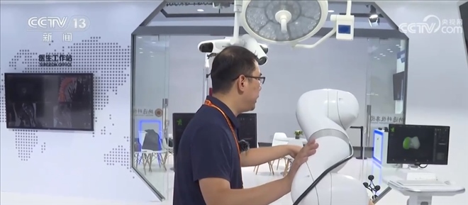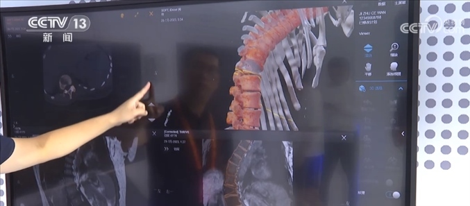 總臺記者 王豐:這里主要呈現(xiàn)的是一個智能手術室的系統(tǒng),這是一套幫助醫(yī)生進行精準手術計劃的設備,比如說我們可以利用一張X光片,一張CT或者一張核磁影像,就可以還原出一個3D的影像,醫(yī)生通過3D的建模,可以精準地看到病灶所在的位置,包括他如何下刀,來精準地制定手術計劃。