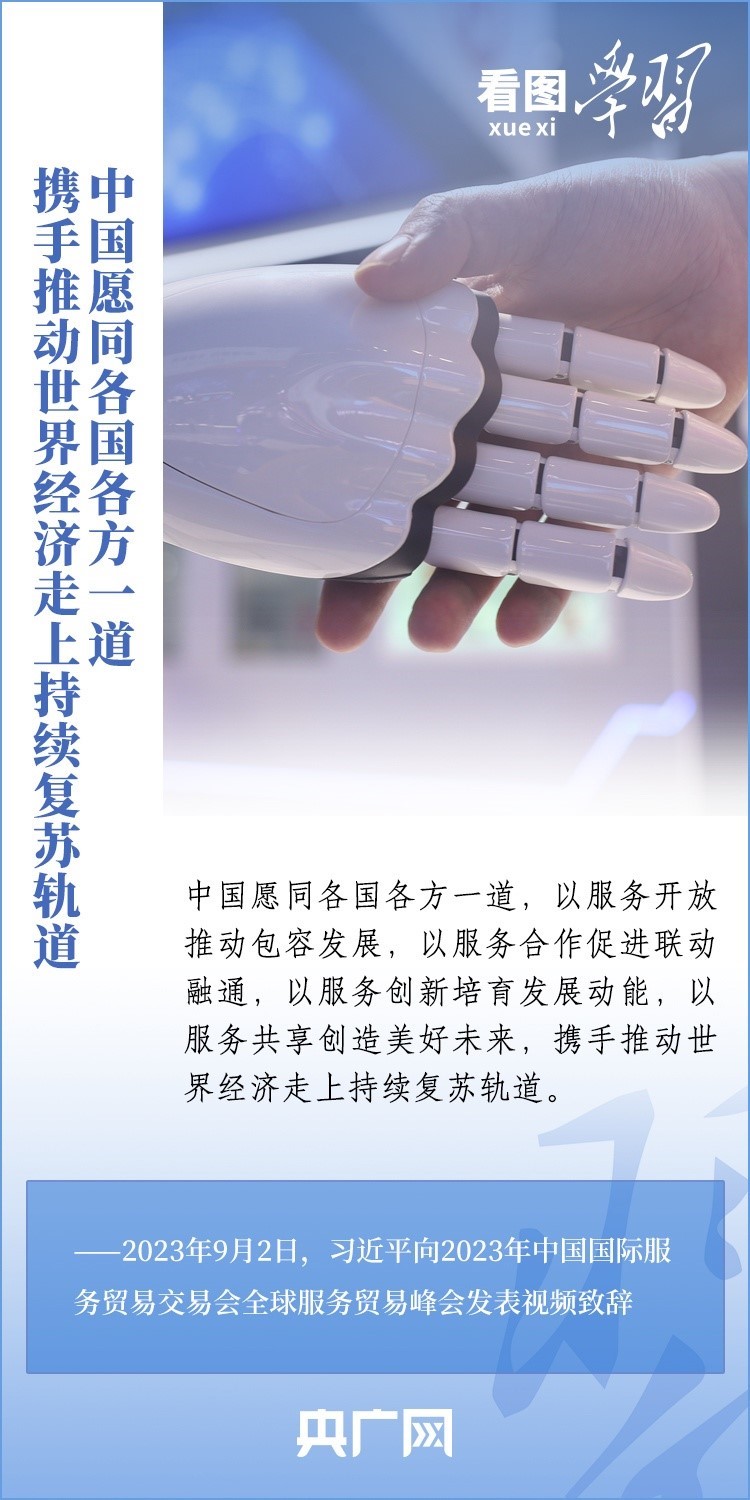 9月2日上午,以“開放引領(lǐng)發(fā)展 合作共贏未來”為主題的2023年中國國際服務(wù)貿(mào)易交易會在北京舉行。國家主席習(xí)近平向2023年中國國際服務(wù)貿(mào)易交易會全球服務(wù)貿(mào)易峰會發(fā)表視頻致辭表示,中國愿同各國各方一道,攜手推動(dòng)世界經(jīng)濟(jì)走上持續(xù)復(fù)蘇軌道。一起來學(xué)習(xí)!