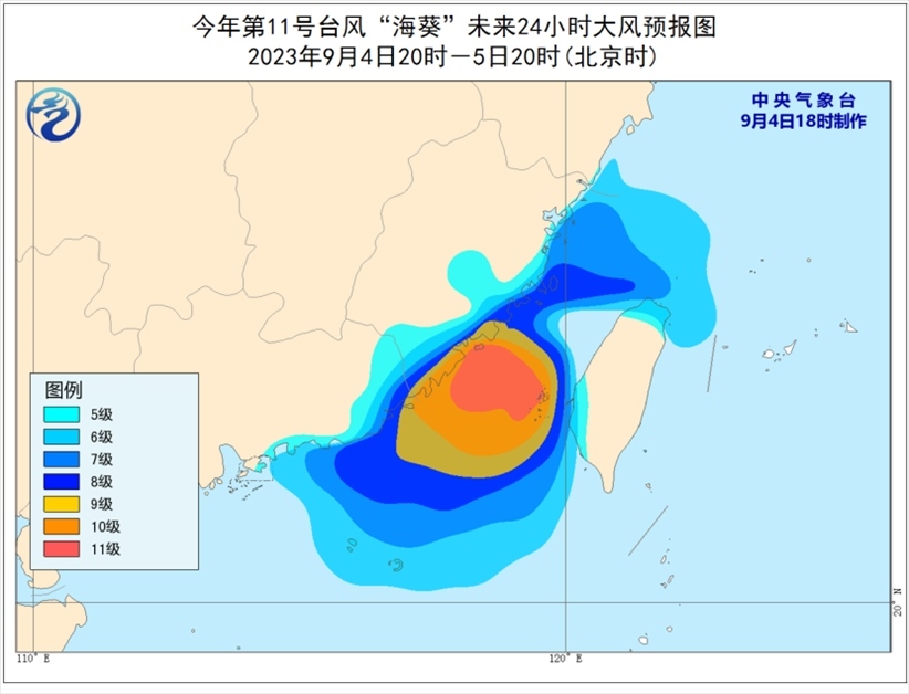 大風(fēng)預(yù)報(bào):9月4日20時(shí)至5日20時(shí),臺(tái)灣海峽、東海西南部、南海東北部以及福建沿海、廣東中東部沿海、臺(tái)灣島西部和北部沿海將有6-8級(jí)、陣風(fēng)9-10級(jí)大風(fēng),部分海域或地區(qū)的風(fēng)力有9-11級(jí),陣風(fēng)12-13級(jí)。