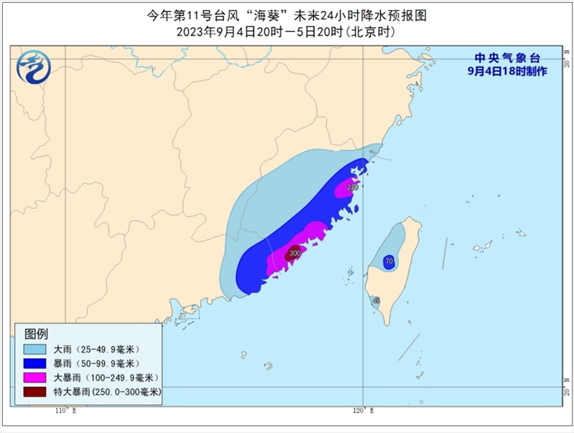 降水預(yù)報(bào):9月4日20時(shí)至5日20時(shí),福建大部、廣東東部、江西東南部、浙江東南部、臺(tái)灣島西部等地部分地區(qū)有大到暴雨,其中,福建東部、廣東東南部等地部分地區(qū)有大暴雨,局地特大暴雨(250-300毫米)。上述部分地區(qū)伴有短時(shí)強(qiáng)降水(最大小時(shí)降雨量30-50毫米,局地可超過70毫米),局地有雷暴大風(fēng)等強(qiáng)對流天氣。
