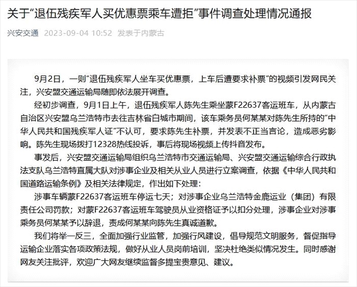 ·興安盟交通運輸局通報“退伍殘疾軍人買優(yōu)惠票乘車遭拒”:涉事乘務(wù)員被辭退。