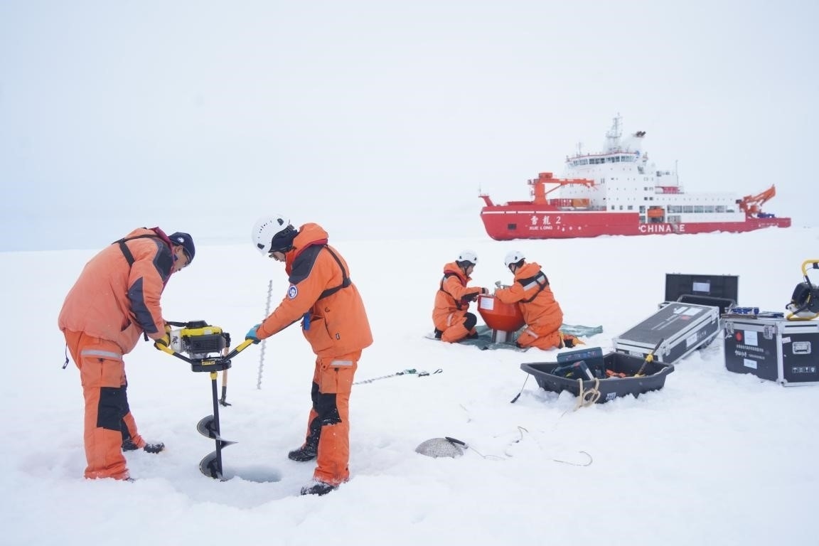 中國(guó)第13次北冰洋科學(xué)考察隊(duì)在北極點(diǎn)附近開(kāi)展海冰綜合作業(yè)