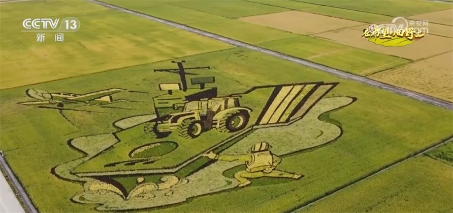總臺(tái)央視記者 蔣樹林:金秋9月的稻田是什么顏色的?9月的稻香又是什么味道?來這里,有可能會(huì)找到您想要的答案。我現(xiàn)在是在黑龍江北大荒閆家崗農(nóng)場。大家來看,這個(gè)稻田觀景臺(tái)有十多米高,因此站在這里,秋日稻田大片的圖案映入眼簾,今年稻田畫以“鄉(xiāng)村振興”“數(shù)字農(nóng)業(yè)”為主題,生動(dòng)展現(xiàn)了“讓農(nóng)業(yè)更美好、讓農(nóng)民更幸?!钡拿篮迷妇啊5咎锂嬍寝r(nóng)民們勤勞與智慧的展現(xiàn),他們用稻田畫為家鄉(xiāng)水稻代言,而對于在黑土地打拼的北大荒人而言,還有更重要的意義。
