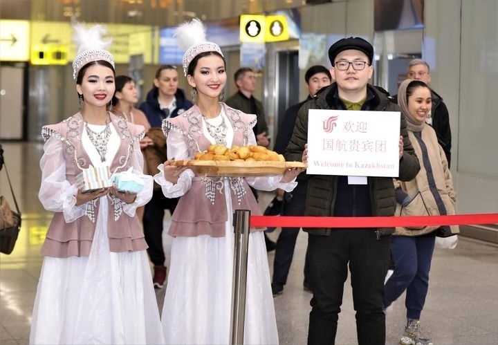 4月21日,在哈薩克斯坦首都阿斯塔納的納扎爾巴耶夫國際機(jī)場(chǎng),哈方工作人員為搭乘國航北京-西安-阿斯塔納航線首班飛機(jī)抵達(dá)的旅客舉行歡迎儀式。