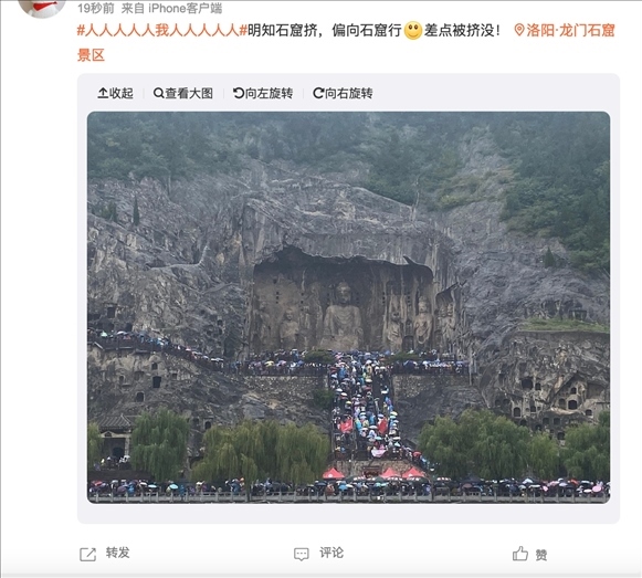有定位在龍門石窟景區(qū)的網(wǎng)友發(fā)布圖片并配文稱:“明知石窟擠,偏向石窟行。差點(diǎn)被擠沒(méi)!”