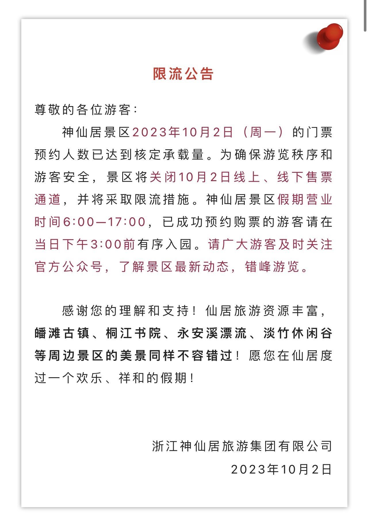臺(tái)州神仙居景區(qū)于10月2日零點(diǎn)就發(fā)布當(dāng)日門票已約滿的消息。
