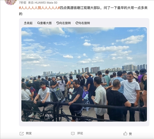 前往浙江錢塘江觀潮的網(wǎng)友發(fā)布消息稱:“四點(diǎn)偶遇錢塘江觀潮大部隊(duì),問(wèn)了一下最早的大哥一點(diǎn)多來(lái)的”。