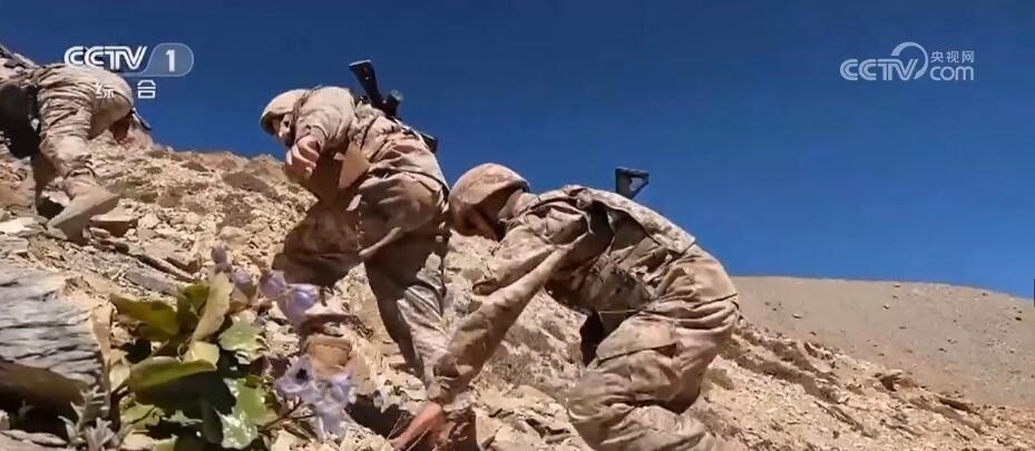 一路走走停停艱難前行。巡邏車(chē)行駛至距離點(diǎn)位6公里處停了下來(lái),由于道路塌陷,官兵們只好下車(chē)改為徒步巡邏。行走在坡度近70度的陡峭山路上,路面全是碎石,加上海拔不斷攀升,這對(duì)巡邏官兵的體能是極大的挑戰(zhàn)。經(jīng)過(guò)近4個(gè)小時(shí)的艱難攀爬,巡邏分隊(duì)終于到達(dá)了點(diǎn)位。