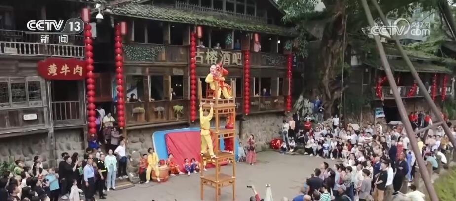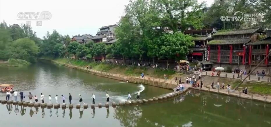 在四川洪雅縣的柳江古鎮(zhèn),當(dāng)?shù)赝瞥鰧嵕把莩?、?jīng)典誦讀、非遺巡演等多項活動。游客們漫步于山水如畫的詩意古鎮(zhèn)中,觀看水上實景演出,感受非遺民俗魅力,歡度假期。