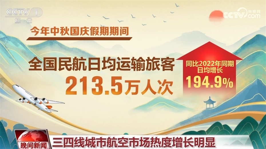 民航方面,今年中秋國慶假期期間,全國民航日均運輸旅客213.5萬人次,同比2022年同期日均增長194.9%。除了北京、上海、重慶、三亞等熱門城市航線火爆外,三四線城市的航空市場熱度增長明顯,直接帶動了當?shù)氐慕?jīng)濟。