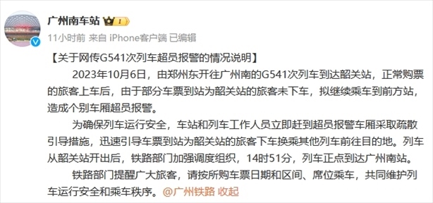 ·廣州南站通報(bào)高鐵超員報(bào)警:部分到站旅客未下車(chē),擬繼續(xù)乘車(chē)到前方站。