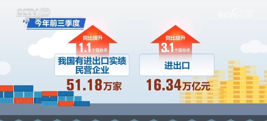2023年前三季度,我國有進(jìn)出口實績的民營企業(yè)51.18萬家,進(jìn)出口16.34萬億元,分別占整體的85.7%、53.1%,同比分別提升1.1個、3.1個百分點。