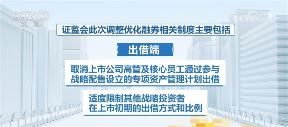 證監(jiān)會此次調(diào)整優(yōu)化融券相關(guān)制度主要包括:融券端,將融券保證金比例由不得低于50%上調(diào)至80%,對私募證券投資基金參與融券的保證金比例上調(diào)至100%;出借端,取消上市公司高管及核心員工通過參與戰(zhàn)略配售設(shè)立的專項(xiàng)資產(chǎn)管理計劃出借,適度限制其他戰(zhàn)略投資者在上市初期的出借方式和比例。