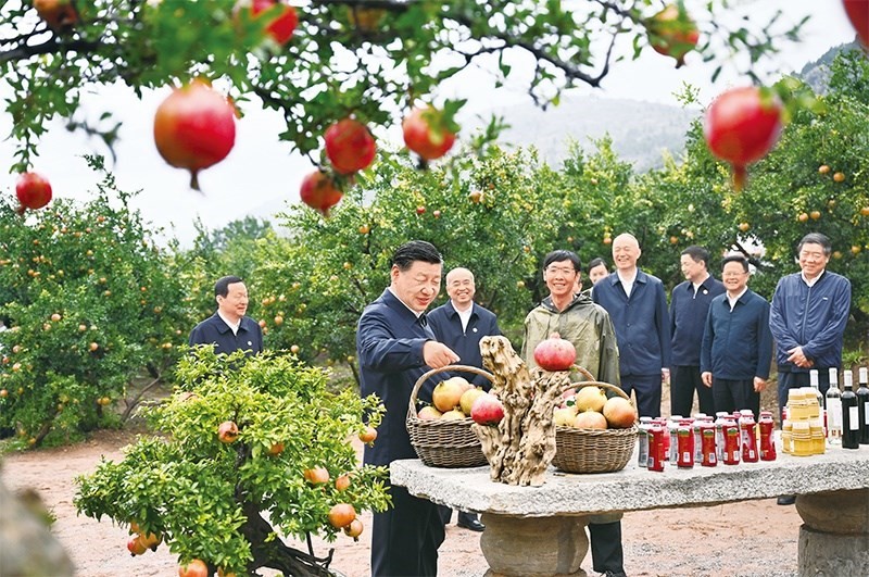 2023年9月24日,中共中央總書記、國家主席、中央軍委主席習(xí)近平在浙江考察結(jié)束返京途中,來到山東省棗莊市考察。這是習(xí)近平在位于嶧城區(qū)的冠世榴園石榴種植園了解石榴產(chǎn)業(yè)發(fā)展情況。 新華社記者 燕雁/攝