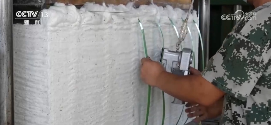 在當(dāng)?shù)氐拿藁庸S(chǎng)車(chē)間內(nèi)機(jī)器轟鳴,工人們有序地將剛收回來(lái)的棉花裝卸、碼垛。